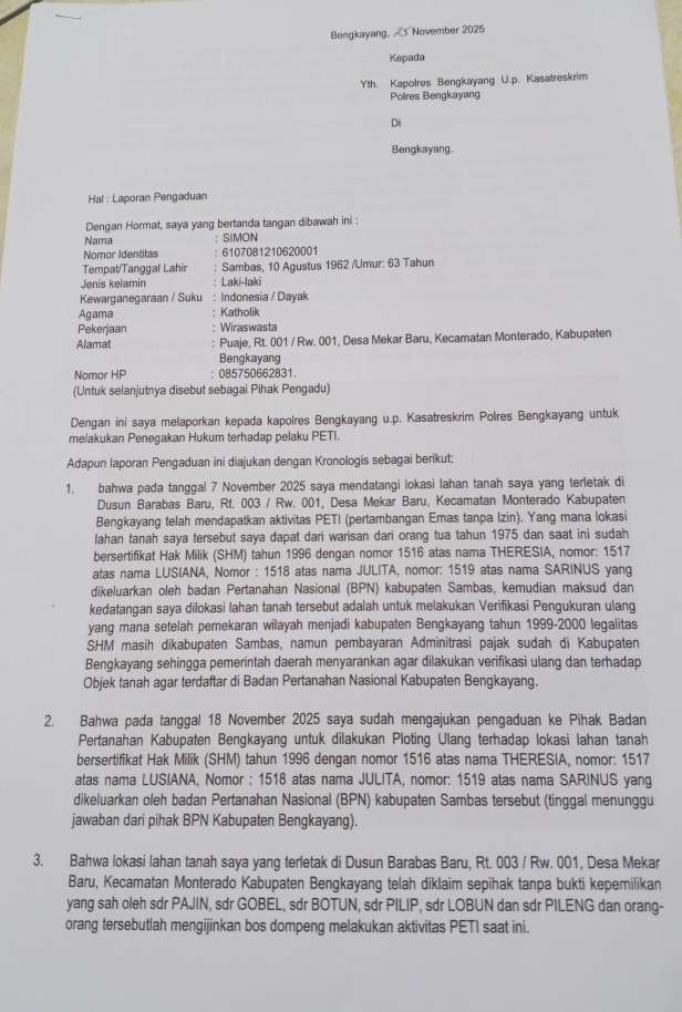 “Saya tidak pernah memberikan izin apa pun. Lahan bersertifikat ini kini rusak parah akibat PETI,” tegas Simon dalam laporannya.