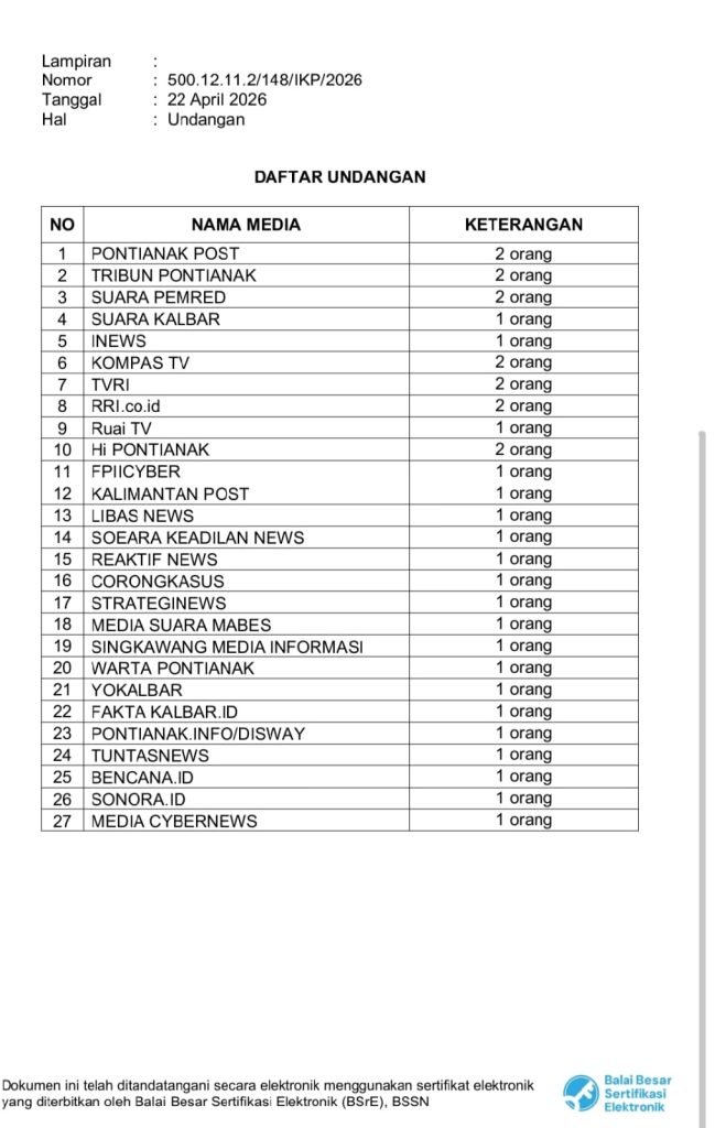 Berdasarkan surat undangan bernomor 500.12.11.2/148/IKP/2026 tertanggal 22 April 2026, pertemuan ini bertujuan meningkatkan kualitas penyampaian informasi kepada masyarakat agar lebih akurat, berimbang, dan konstruktif.