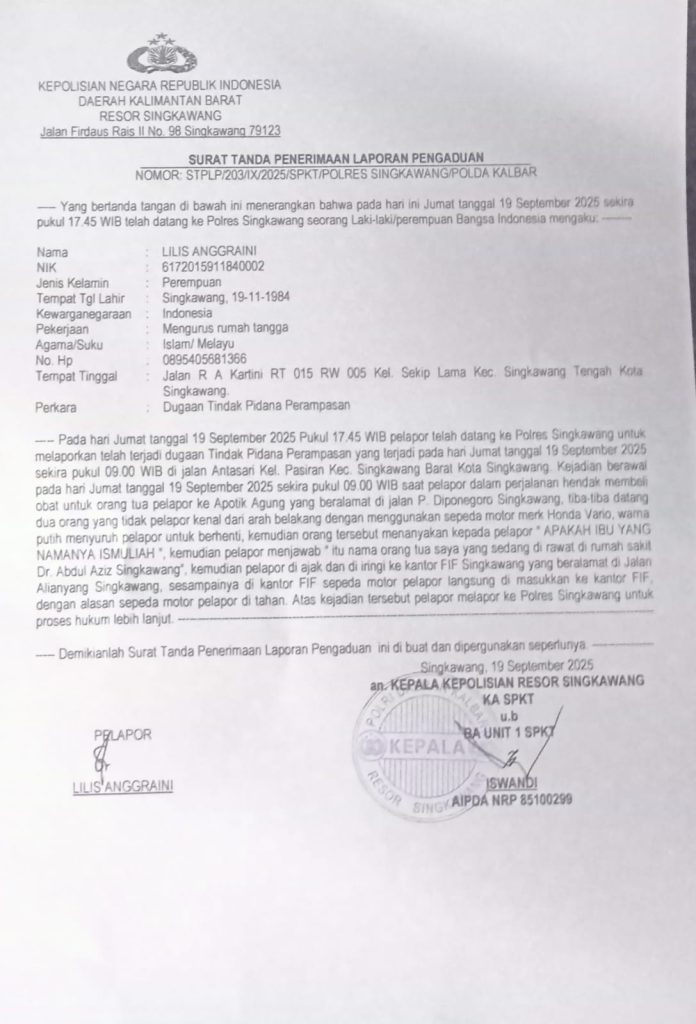 Lilis selaku korban perampasan motor oleh debt collector bernama Ucok langsung membuat kan laporan polisi dan diterima dengan nomor: 203/IX/2025/SPKT/Polres Singkawang yang didampingi oleh LBH Rakha sebagai penerima Kuasa dan berharap peristiwa yang dialaminya dapat diproses secara Hukum.