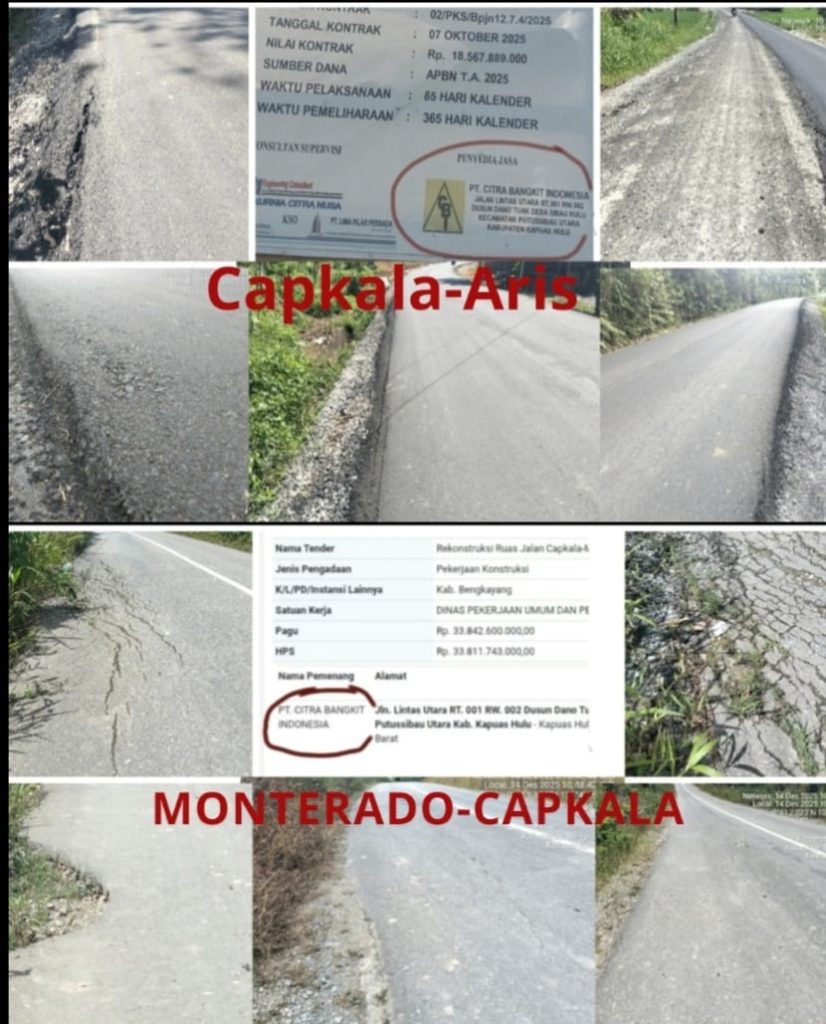 Sorotan ini semakin menguat setelah hasil investigasi lapangan Minggu, 14 Desember 2025, menemukan bahwa proyek lama Capkala–Monterado yang dikerjakan perusahaan yang sama pada tahun 2023 kini telah menunjukkan kerusakan dini, berupa retak, pengelupasan, hingga lubang di sejumlah titik, meski usia jalan tergolong masih baru.