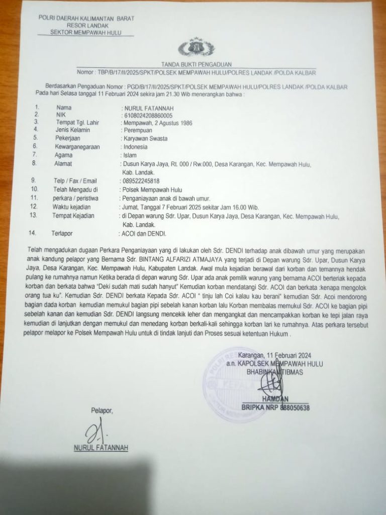 Dengan tempat kejadian peristiwa ( TKP ) di depan rumah toko milik Upar, Dusun Karya Jaya.RT/RW.000/000. Desa Karangan Kecamatan Mempawah Hulu Kabupaten Landak Hingga sampai saat ini Januari 2026., Belum ada kejelasan hukum dari unit PPA, Polres Landak terhadap pelaku ( terlapor )